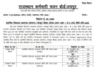 राजस्थान स्टाफ सिलेक्शन बोर्ड (RSSB) ने प्राइमरी और अपर प्राइमरी शिक्षकों के 7759 रिक्त पदों के लिए भर्ती अधिसूचना जारी की है। जो अभ्यर्थी इस अवसर का इंतजार कर रहे थे, वे जल्द से जल्द आवेदन प्रक्रिया पूरी कर लें। आवेदन की अंतिम तिथि 6 दिसंबर 2025 निर्धारित की गई है। इच्छुक और पात्र उम्मीदवार राजस्थान SSO पोर्टल या RSSB की आधिकारिक वेबसाइट के माध्यम से ऑनलाइन आवेदन कर सकते हैं।